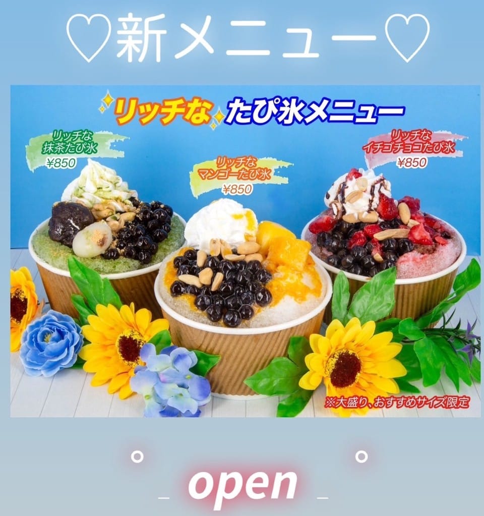 リッチなシリーズ大好評です♪ 投稿者:hawaiikoushi2024年5月26日カテゴリー:未分類 •*¨*•.¸¸リッチなシリーズ•*¨*•.¸¸ リッチな抹茶たぴ氷⇒850円抹茶のたぴ氷に白玉とあずきと生クリームをのせてきな粉のかかった贅沢なたぴ氷です☺︎ リッチなきなこあずきたぴ氷 たぴ氷に白玉とあずきと生クリームがのって、きなこのかかったたぴ氷です リッチなチョコいちごたぴ氷 チョコレートたぴ氷にイチゴの果肉と生クリームがのってます リッチなブルーベリー ブルーベリーたぴ氷にブルーベリー果肉と生クリームがのってます 共有: X で共有 (新しいウィンドウで開きます) X Facebook で共有 (新しいウィンドウで開きます) Facebook いいね 読み込み中… 関連
