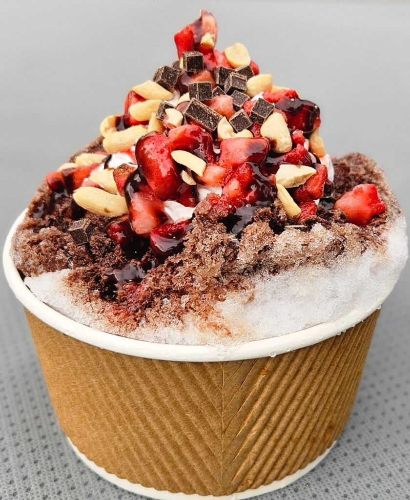 チョコレートのたぴ氷にイチゴの果肉と生クリームがのってます![]()