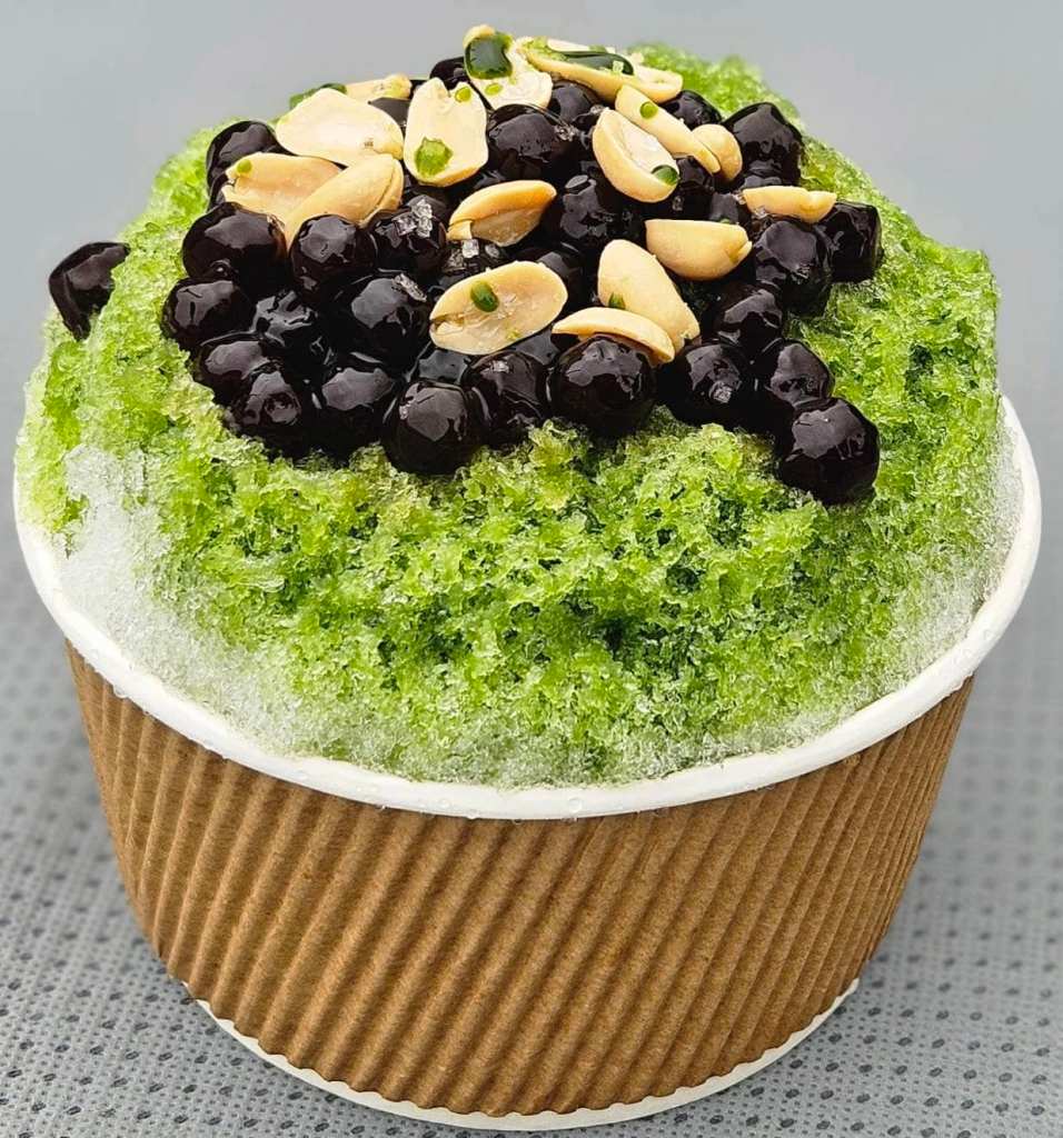 抹茶のたぴ氷の上に白玉、あずき、きな粉、生クリームがのった贅沢なたぴ氷